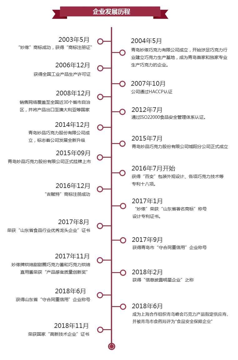 自2004年,青島妙品巧克力股份有限公司已發(fā)展成為集研發(fā)、生產(chǎn)、銷售為一體的專業(yè)化巧克力企業(yè),擁有10余條先進(jìn)生產(chǎn)線的標(biāo)準(zhǔn)化工廠,擁有“妙緣”(2017年獲得山東省著名商標(biāo)稱號),吉賦特等十多個(gè)商標(biāo),三十幾項(xiàng)巧克力專利技術(shù),2018年榮獲國家“高新技術(shù)企業(yè)”證書。 專業(yè)化的銷售團(tuán)隊(duì)實(shí)現(xiàn)線下線上多渠道覆蓋, 營銷網(wǎng)絡(luò)已遍及全國三十幾個(gè)省、市、自治區(qū)并出口澳洲、東南亞、北韓等國家,并獲得了多項(xiàng)榮譽(yù):