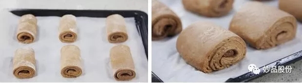 3、卷好的小面團放在鋪了油紙的烤盤里,每個小面團之間要留出足夠的距離。溫度26℃濕度75%左右,發(fā)酵45-50分鐘左右,直到面團變成約8成;