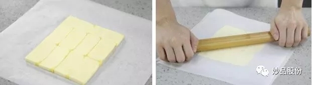 4、將片狀油切成片,在油紙上蓋一層油紙,用搟面杖搟一搟,使黃油片變得更薄一點。
