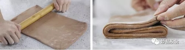 6、將面團再次搟開,搟成一個長方形,從面團的一端1/3處折疊過來,將另一端也折疊過去。將折好的面團包上保鮮膜,放入冰箱冷藏15-20分鐘,使面團得到充分的松弛,并保持面團的低溫。