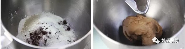 1、高筋粉、低筋粉、干酵母、奶粉攪拌均勻,加入細砂糖、雞蛋牛奶、妙緣巧克力烘焙直用醬(60%)用攪拌機攪勻(也可以用手揉)。攪拌機開2檔,攪打面團至6成左右。