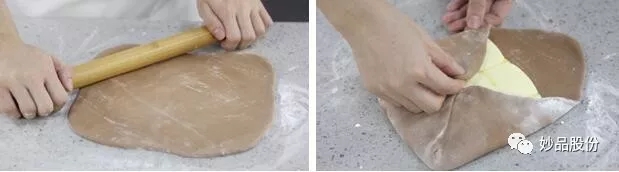 5、臺面上撒一些干面粉防粘,將冷藏好的面團搟開,大小是可以將面團的四個角向中間折疊過來,將黃油片包裹住,將面團的接縫處捏緊。