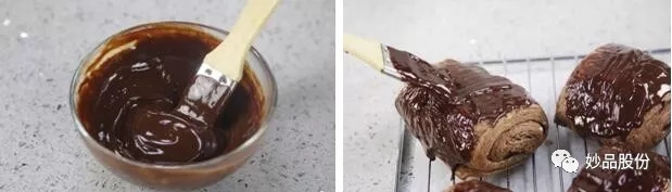 2、將巧克力甘納許趁熱刷在烤好的可頌面包表面,厚厚刷上一層。等冷卻后,巧克力甘納許會凝固。