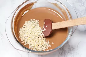 將妙緣巧克力冷飲脆皮醬加熱至33-35度攪勻,加入杏仁碎攪拌,脆皮巧克力外衣就制作完成啦。