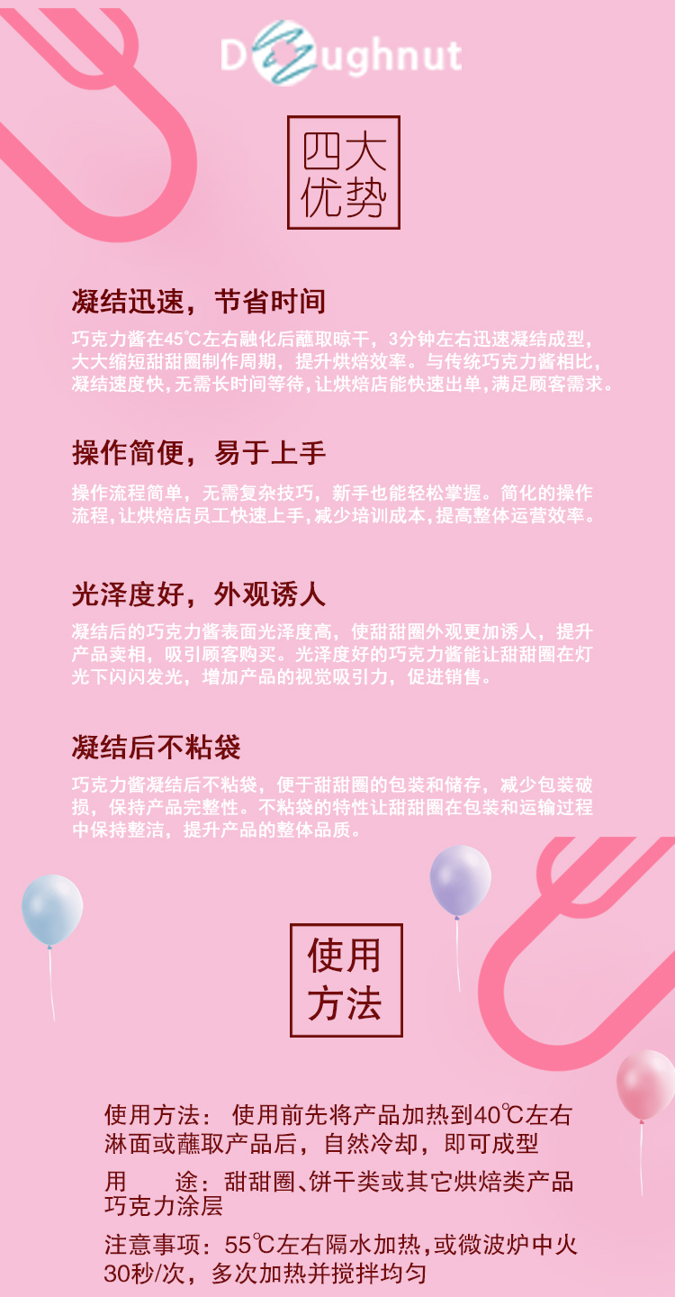 產品使用:使用前先將產品加熱到40℃左右,淋面或蘸取產品后,自然冷卻,即可成型。產品主要用于甜甜圈或餅干類產品、巧克力涂層等。