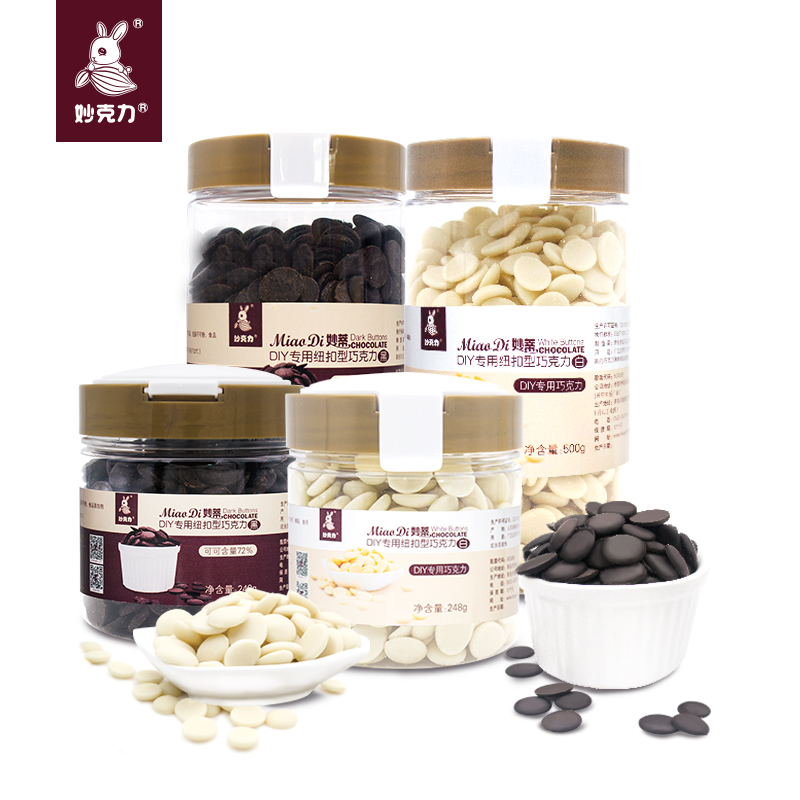 妙蒂DIY專用紐扣型巧克力,原裝進口原料,純可可脂含量達72%,口感均勻持久,甜度適中,調溫后流動性好,操作性強。妙蒂DIY專用紐扣型巧克力適合DIY手工高端巧克力制作、西點慕斯的巧克力淋面或者涂層裝飾。