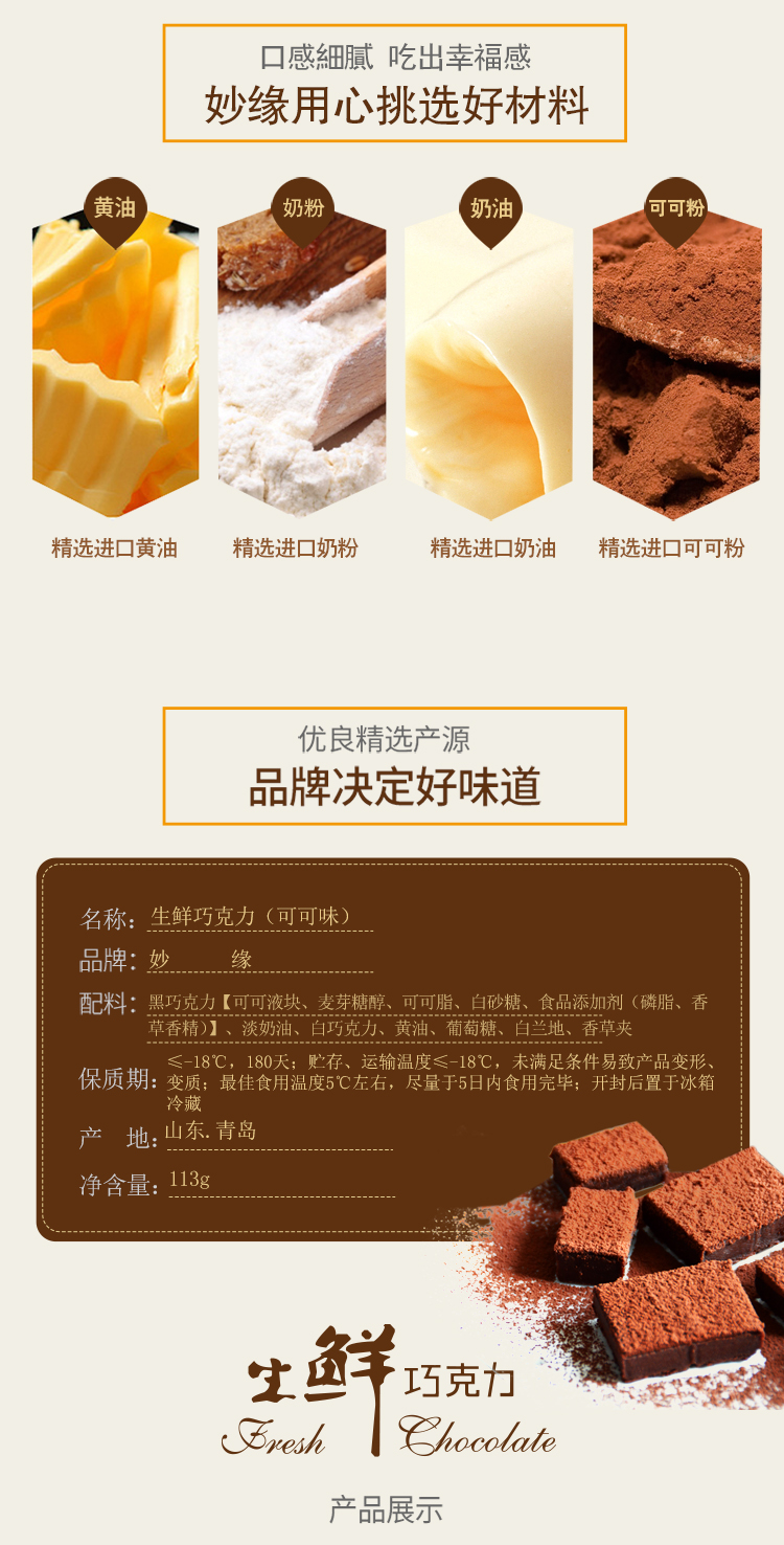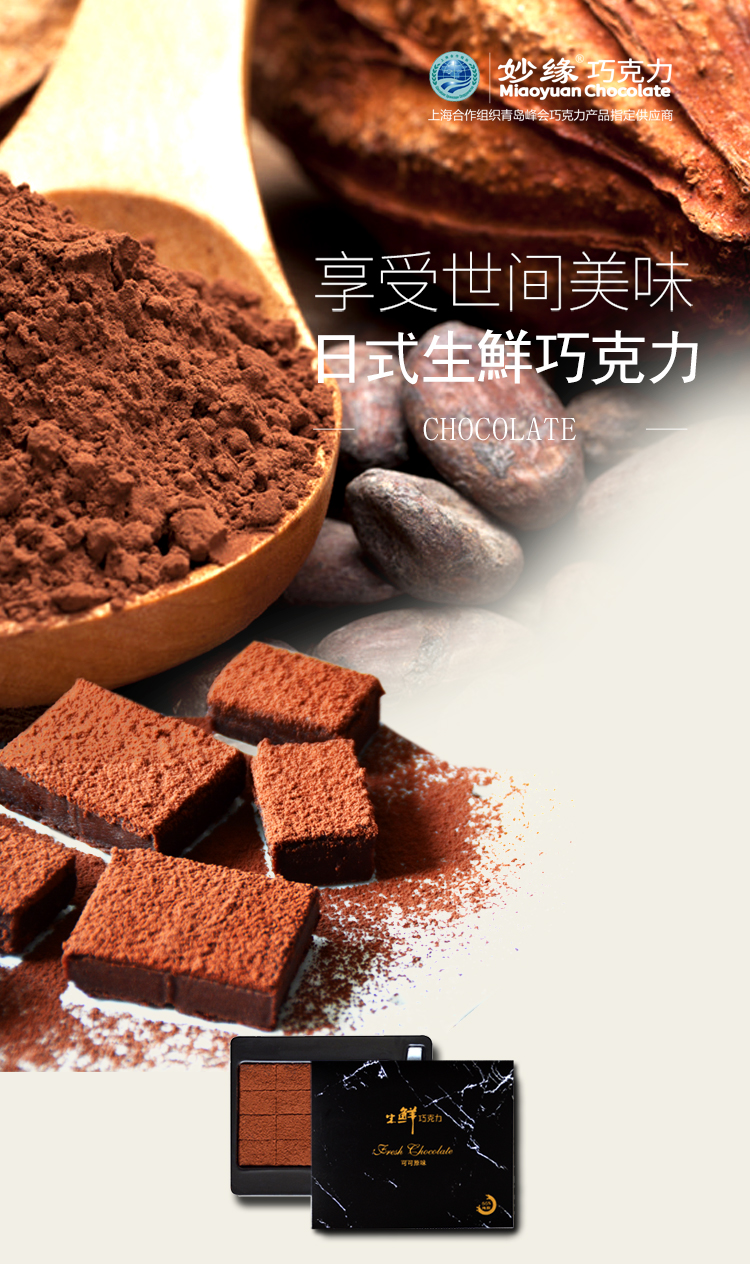 妙緣生鮮巧克力,有可可原味、抹茶味可選,采用進(jìn)口高品質(zhì)巧克力原料,原味生鮮巧克力可可含量高達(dá)55%,抹茶生鮮巧克力可可含量高達(dá)60%。新鮮冰爽,綿軟柔滑,口感好,新鮮原材手工制作,需零下18℃儲藏運(yùn)輸,開封后0至5度食用最佳。