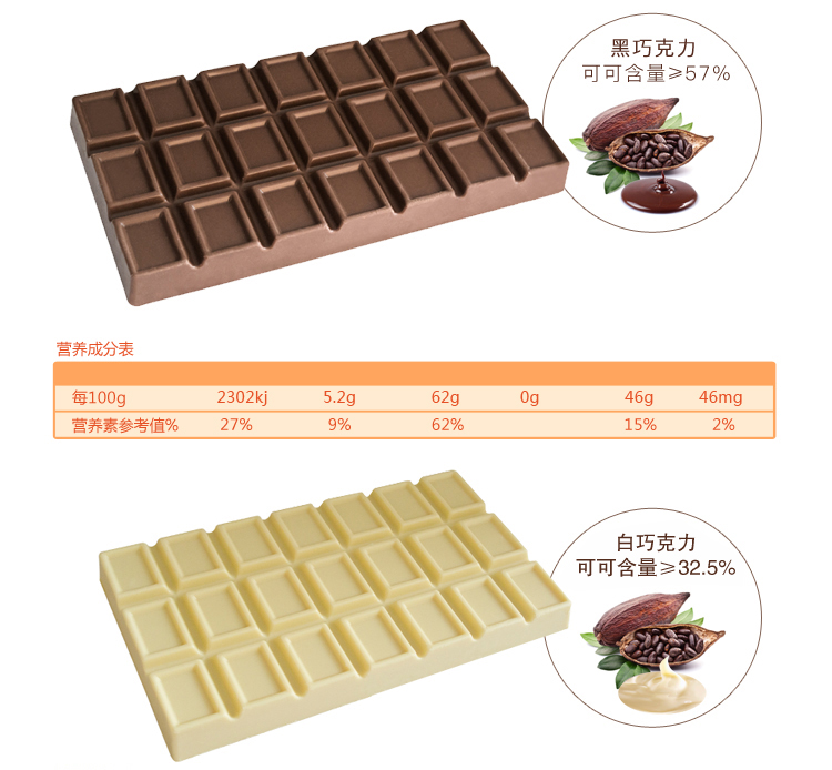 產(chǎn)品口味:黑色苦甜/棕色牛奶/白色 , 可可含量:57% /32%/32.5%