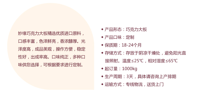 妙緣彩色巧克力磚,也稱工業巧克力大板,精選優質進口原料,口感豐富,色澤鮮亮,香味醇厚;光澤度高,成品美觀;操作方便,穩定性好。妙緣巧克力磚可用于冷飲方面冰激凌、雪糕的巧克力淋面、涂層、蘸醬、裝飾,巧克力餡料調制及手工巧克力的制作等。烘焙方面可用于面包、餅干、西點慕斯涂層淋面、漿料等。