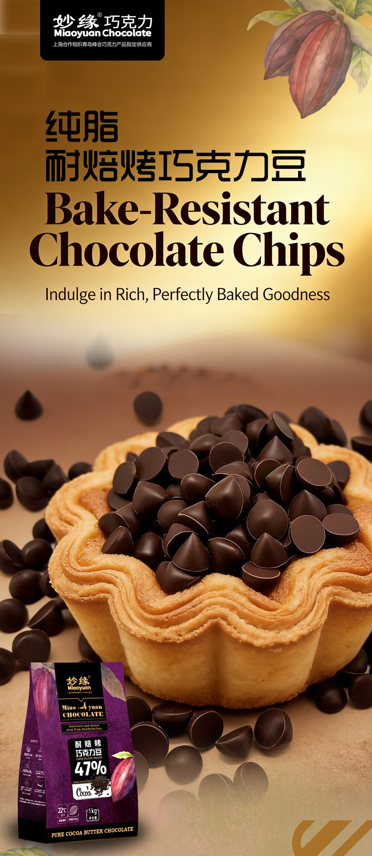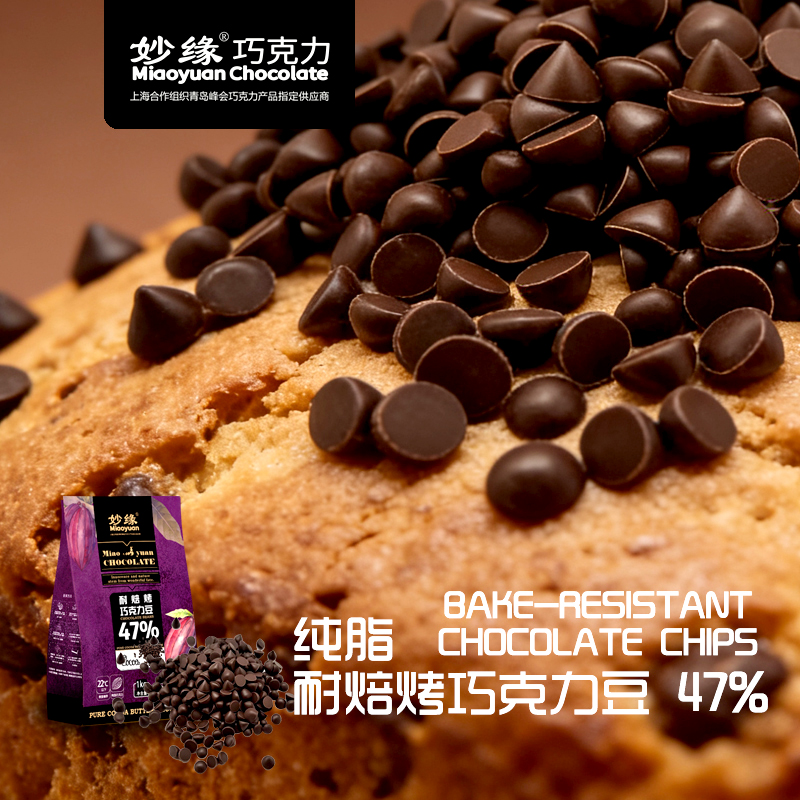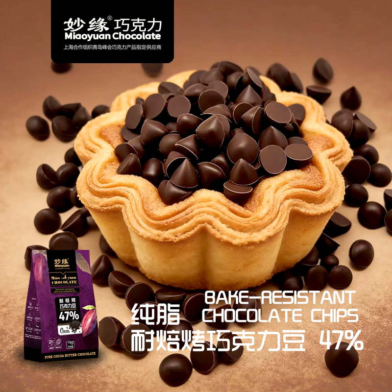 妙緣耐焙烤醇黑巧克力豆,可愛小水滴狀純脂巧克力豆,可可含量達46%以上,口感醇滑,入口即化;顆粒均勻,可達30000粒/kg;由于特別的配方調制,顛覆純脂巧克力熔點低易融化的特性,品質穩定,能夠耐高溫烘焙不變形,味道也和烘焙前一致!。妙緣耐焙烤醇黑巧克力豆適合制作曲奇餅干類、重磅蛋糕、面包吐司,冰淇淋、夾心、預混料等,或者加入少許至撻派餡料增添產品特色及風味!