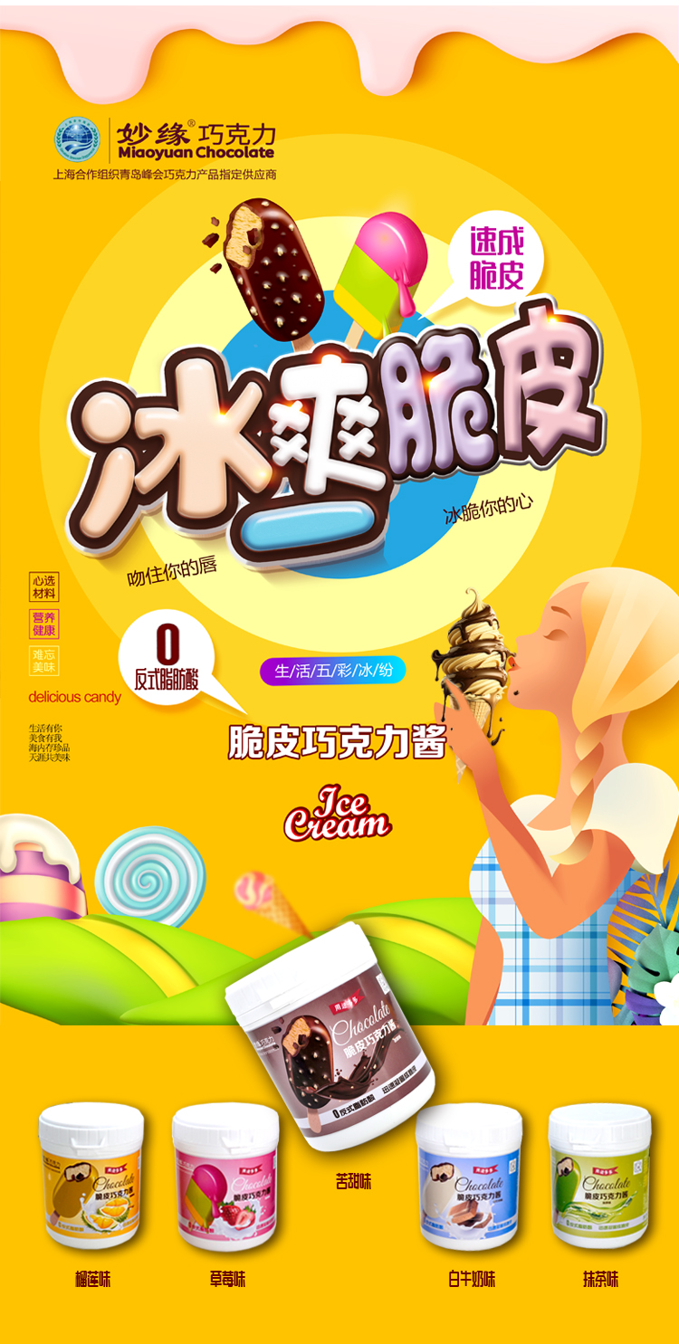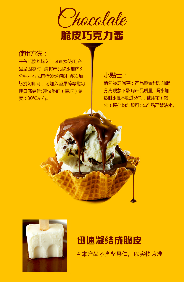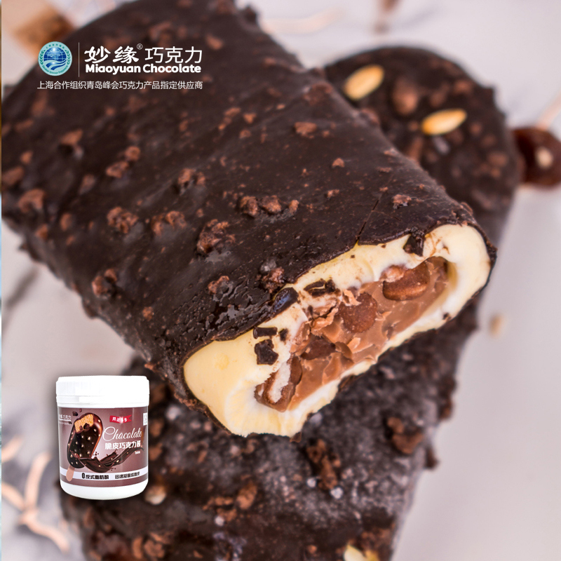 妙緣巧克力脆皮冷飲醬,也稱巧克力脆皮醬,采用進口可可原料加工而成,直接融化后使用,操作簡單快捷,凝固速度快,成品裹衣均勻,酥脆可口。主要用于冷飲方面冰激凌、雪糕的巧克力表面脆皮、裹衣等,