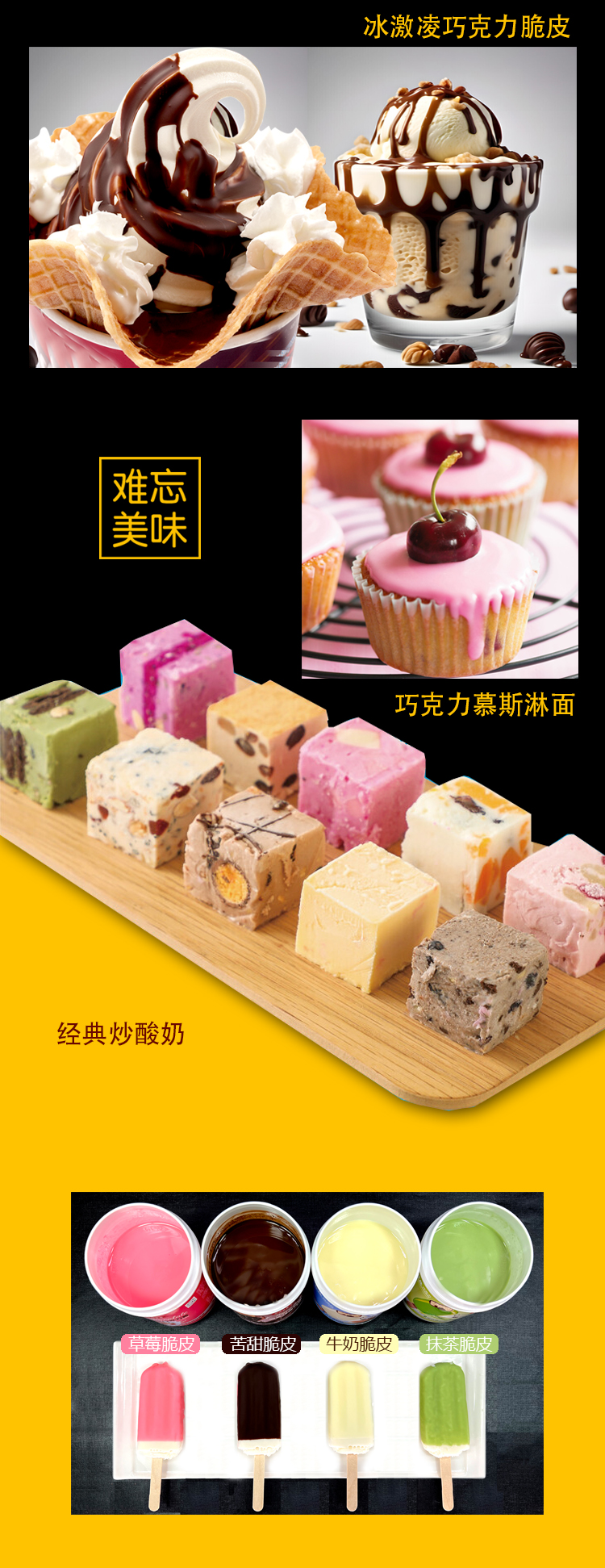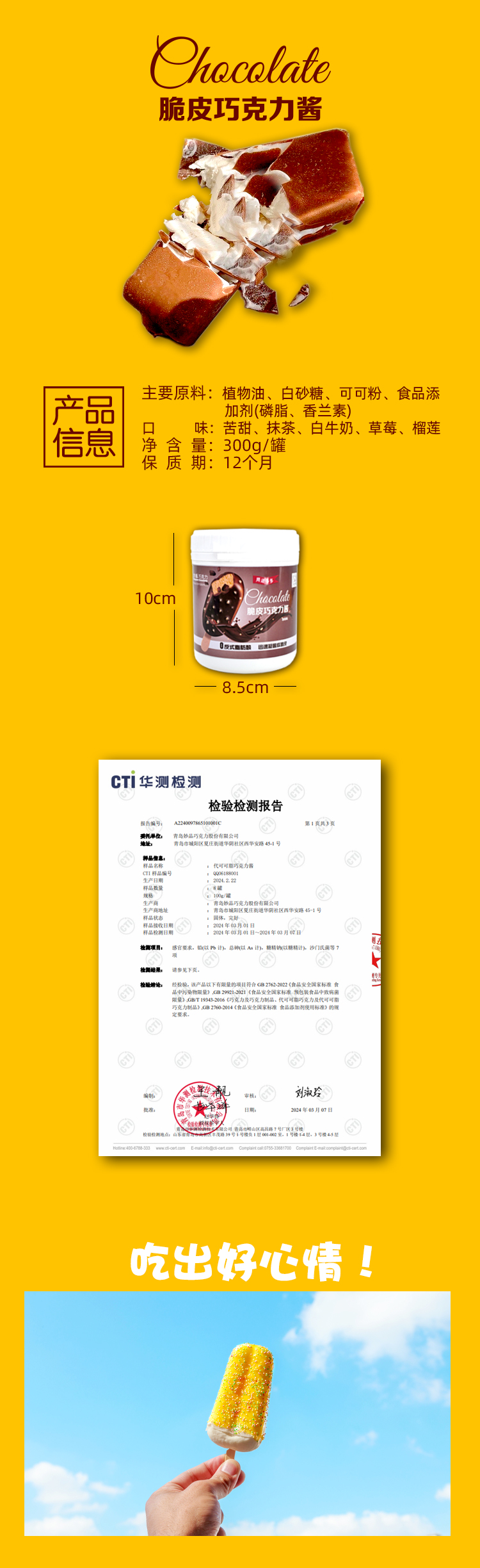 產品分類: 妙緣巧克力脆皮冷飲醬產品形態:液態產品口味:苦甜味、草莓味、抹茶味、藍莓味、菠蘿味、香蕉味、白牛奶味等(可定制)產品使用:主要用于冷飲方面冰激凌、雪糕的巧克力表面脆皮、裹衣等